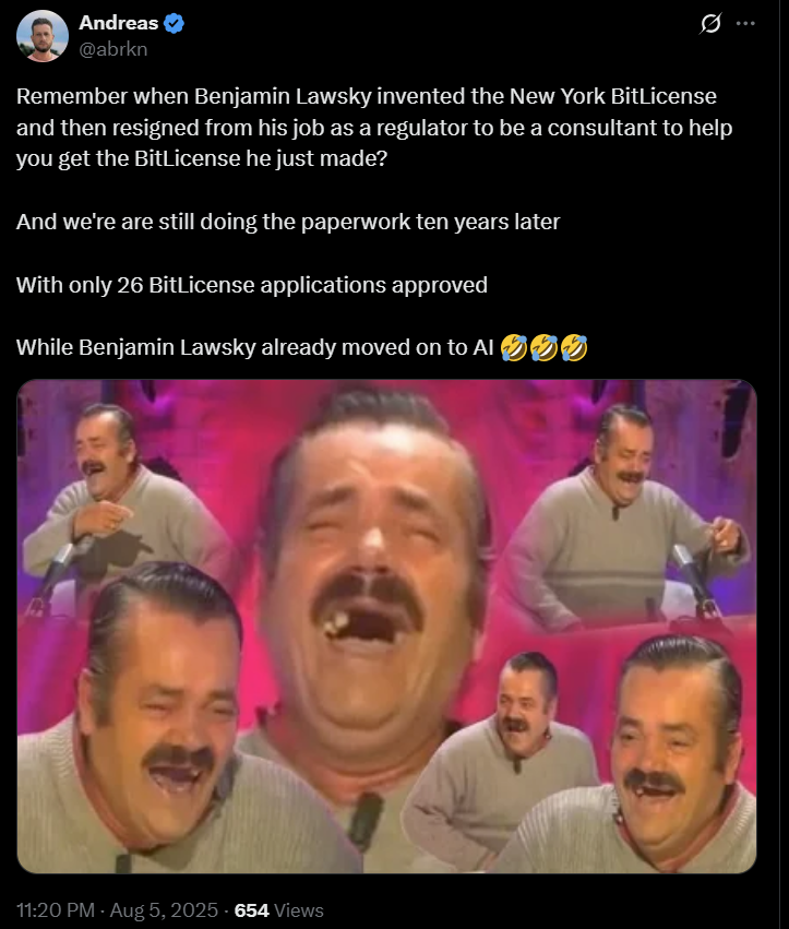 «Давайте откажемся от лицензии на биткоин и позволим ему свободно циркулировать в нашем городе, - заявил Адамс на конференции Bitcoin 2025 в мае. - Хотя сбор за подачу заявки на BitLicense составляет 5000 долларов, фактическая стоимость получения BitLicense значительно выше, - написали партнер юридической фирмы Pillsbury Law Брайан Монтгомери на Х и его коллега Джонна Перселл. - Компании часто тратят в разы больше при подготовке заявки на BitLicense и также обязаны соблюдать требования к капиталу, установленные Департаментом финансовых услуг Нью-Йорка (NYDFS)», - отметили они.