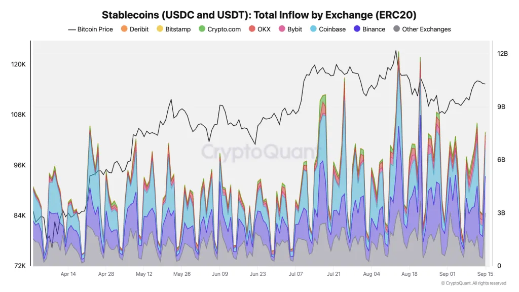«»Сухой порох» для возможного ралли на крипторынке накапливается: депозиты стейблкоинов на биржах росли в преддверии решения по процентной ставке. Согласно последним данным, приток USDT и USDC (ERC-20) составил $2,1 млрд на Binance, $1,6 млрд на Coinbase и еще $3 млрд на других площадках», — отмечают эксперты CryptoQuant.