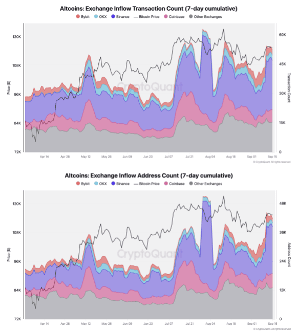 Кроме того, за последнюю неделю количество депозитов альткоинов на централизованных платформах выросло до 55 000, что значительно выше показателей начала 2025 года (20 000–30 000). Почти половина от этого объема — 25 000 депозитов — пришлись на Binance.