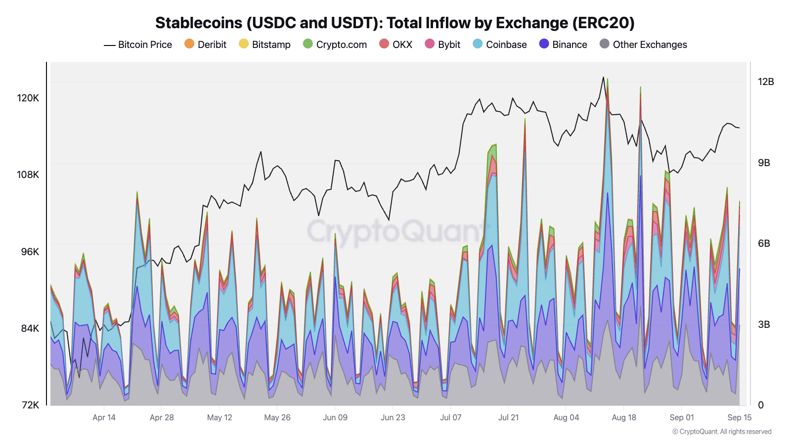 По данным аналитиков CryptoQuant, зафиксирован приток стейблкоинов USDT и USDC на сумму более $2,1 млрд — это больше, чем на любую другую платформу. Эксперты отмечают, что пользователи формируют капитал в ожидании потенциального роста рынка.