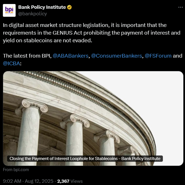 В августе Институт банковской политики (BPI) - лоббистская группа, поддерживаемая крупными банками США - призвал регуляторов закрыть, по его словам, лазейку, которая может позволить биржам или аффилированным лицам выплачивать доходность через сторонних партнеров.