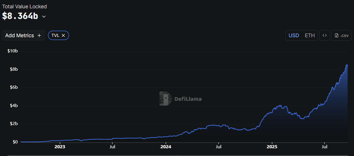 Morpho входит в число крупнейших протоколов децентрализованного кредитования в криптовалютной индустрии с общей заблокированной стоимостью (TVL) более 8,3 млрд долларов США, согласно данным DefiLlama. В 2025 году долларовая стоимость TVL протокола резко выросла, отражая растущий спрос на ончейн-кредитование.