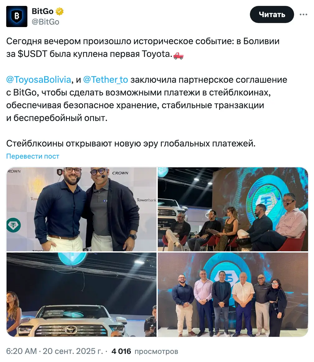 Генеральный директор Tether Паоло Ардоино сообщил в воскресенье, что Toyota, Yamaha и BYD принимают Tether (USDT) к оплате. Компания BitGo, занимающаяся криптовалютной безопасностью, подтвердила, что в субботу в Боливии за USDT была куплена первая Toyota.