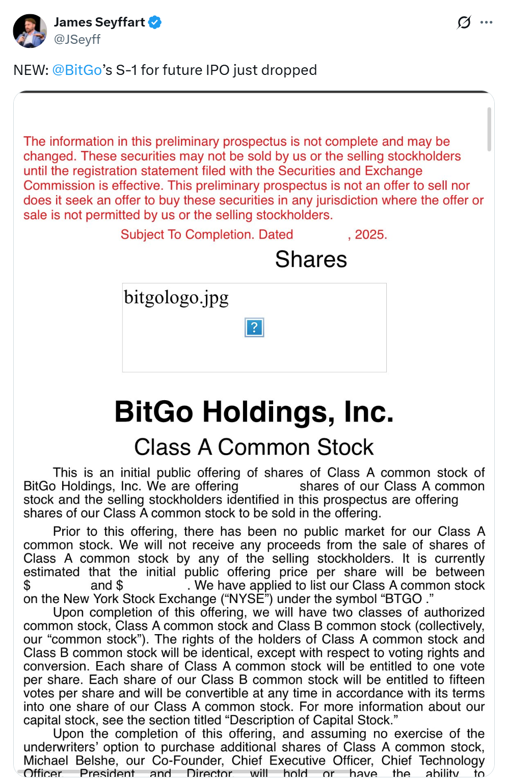 BitGo подает заявку на IPO в США. Источник: James Seyffart.