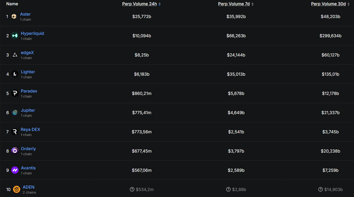 - Aster заняла первое место среди DEX с бессрочными фьючерсами по объему торгов.