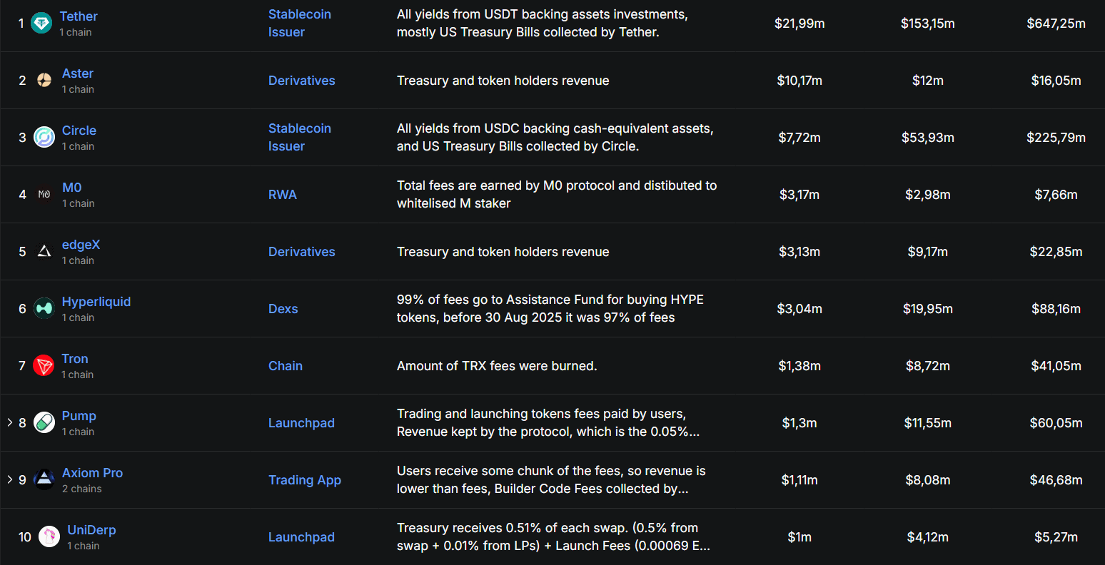 Aster также занимает второе место в секторе по суточному объему собранных комиссий — $10,17 млн. Hyperliquid в этом рейтинге находится на шестом месте.
