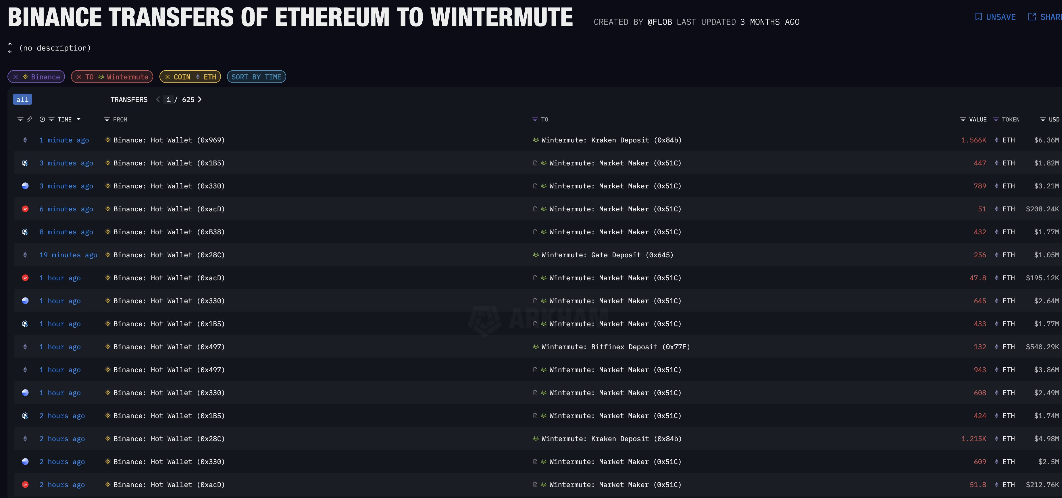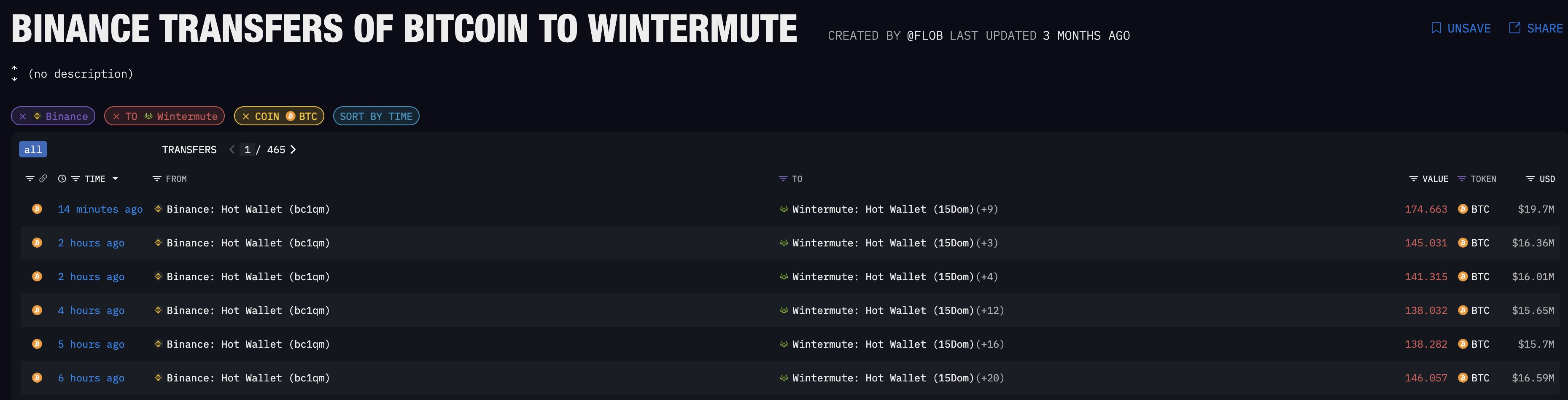 Еще одной монетой, курсом которой, как считает MartyParty, Binance успешно манипулирует, оказался биткоин. Вот скрин переводов криптобиржи BTC на Wintermute: