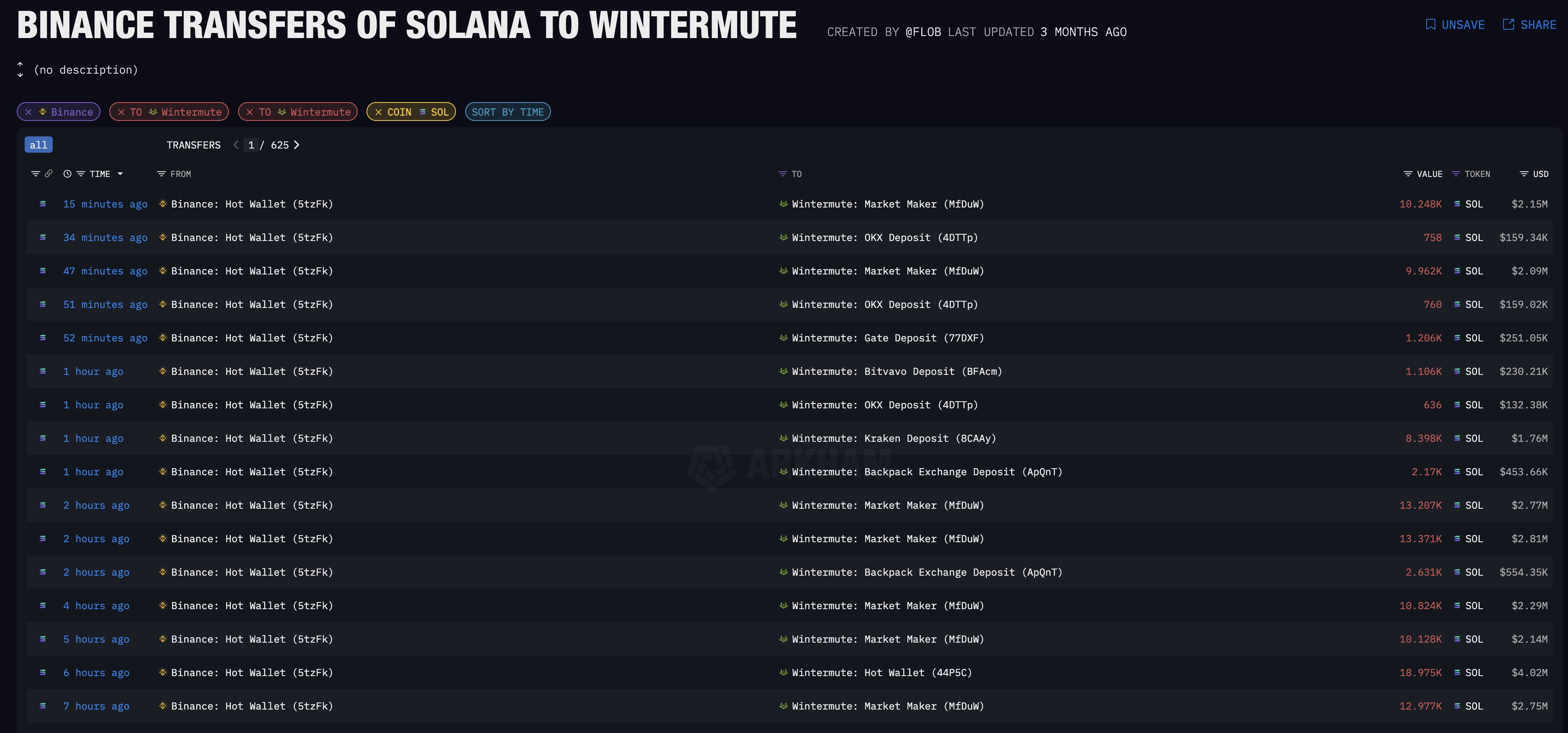 Представители криптоиндустрии не впервые обвиняют Binance в манипулировании рынком, но на этот раз, отметил аналитик MartyParty, операции превысили все мыслимые и немыслимые масштабы. Речь идет о распродаже трех криптовалют через маркет-мейкера Wintermute. MartyParty обратил внимание на крупные переводы Solana на платформу: