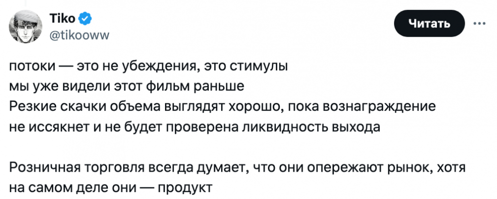Другой участник сообщества сравнил всплеск объемов с сезоном биржевых комиссий за майнинг в 2018 году и летом DeFi 2021 года. Пользователь отметил, что такие события плохо заканчиваются для розничных трейдеров.