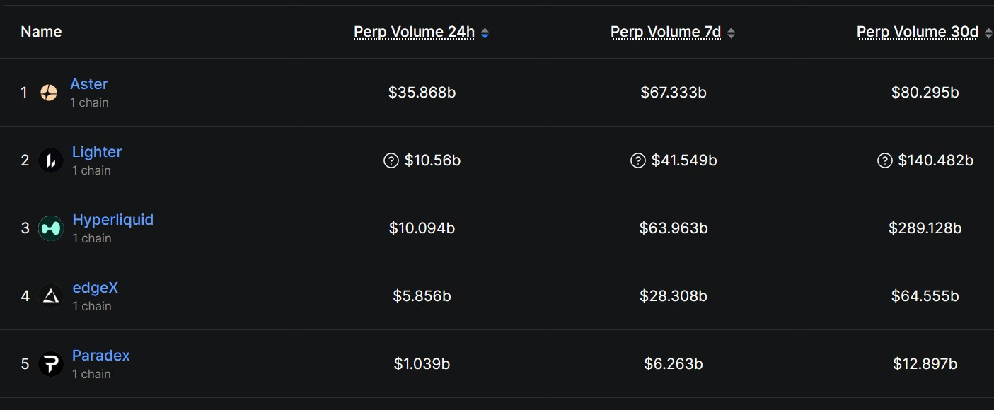 Aster возглавила рейтинг с объемом торгов почти $36 млрд за 24 часа, что составило более 50% от общей активности на бессрочных децентрализованных биржах в четверг. Платформа обогнала конкурентов, таких как Hyperliquid и Lighter, зафиксировав объемы торгов более $10 млрд.