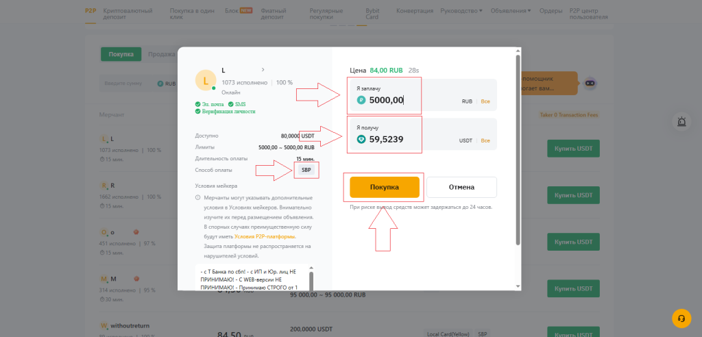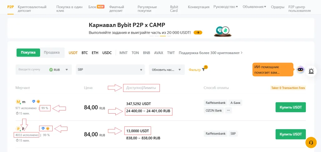 Самый сбалансированный способ — покупка криптовалюты через P2P на Bybit. Биржа обеспечивает ликвидность и безопасность через эскроу и нулевую комиссию.