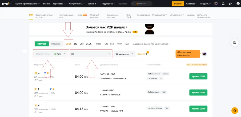 Шаг 3. Настройте фильтры: укажите валюту (RUB), актив (например, USDT) и способ оплаты (карта, СБП, перевод на счет).