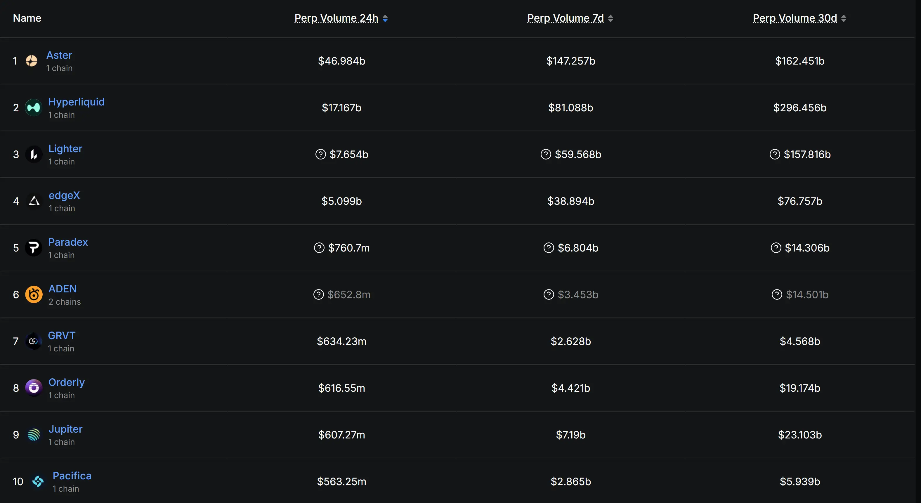 За последние сутки объем транзакций Aster составил около $47 млрд, что более чем вдвое превышает объём Hyperliquid в 17 миллиардов долларов, согласно данным DefiLlama.
