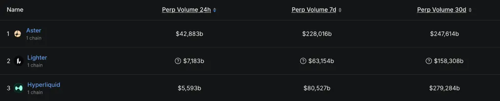 Торговая площадка в сети BNB Chain также стала лидером среди фьючерсных DEX по объему торгов. За прошедшие 24 часа оборот на Aster составил $42 млрд. Для сравнения, Lighter и Hyperliquid зафиксировали $7 млрд и $5 млрд.