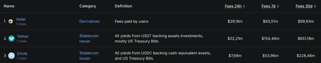 Децентрализованная биржа Aster заняла первую строчку в рейтинге протоколов DeFi Llama по объему комиссий. За последние сутки показатель платформы превысил $29 млн против $22 млн и $7 млн у Tether и Circle соответственно.