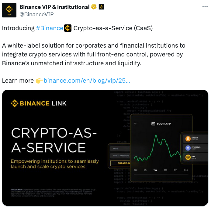 Это произошло после того, как Binance заявила, что «спрос клиентов на цифровые активы никогда не был столь высок», отметив, что для организаций TradFi предоставление доступа к криптовалюте «больше не является опциональным». Один из крупнейших конкурентов Binance, Coinbase, также начал предлагать решение «криптовалюта как услуга» в июне.