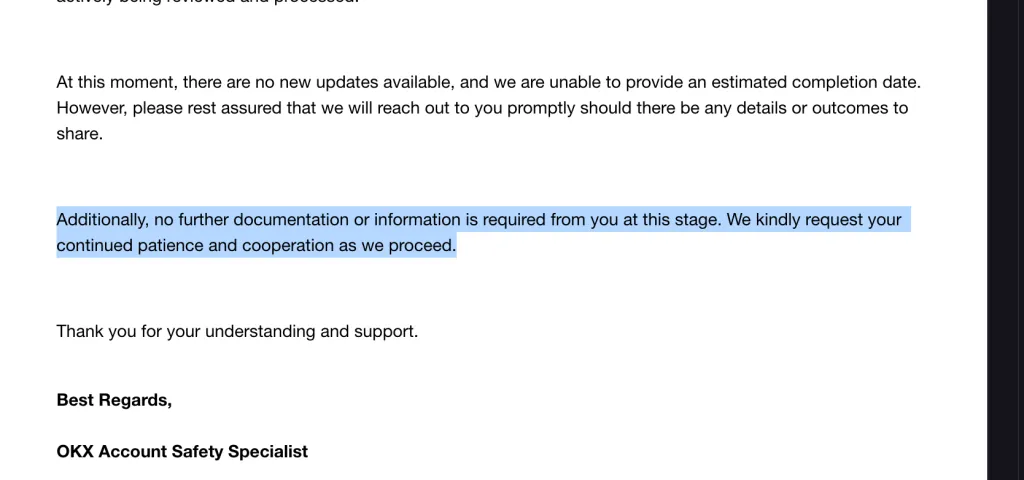 29 сентября, спустя девять месяцев разбирательств, OKX закрыла тикет без возможности пересмотра. Аккаунт пользователя остался заблокированным, а средства замороженными.