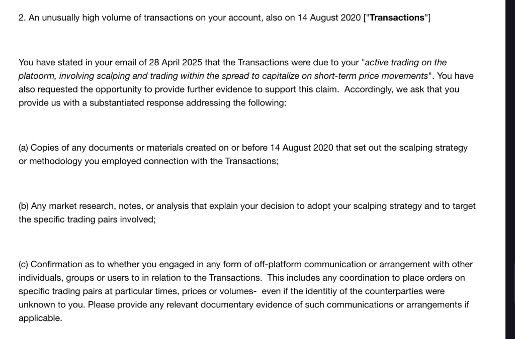 Через неделю, 30 июля, биржа потребовала в течение семи дней отправить дополнительные документы, объясняющие методологию трейдинга и то, как клиент выбирал торговые пары.
