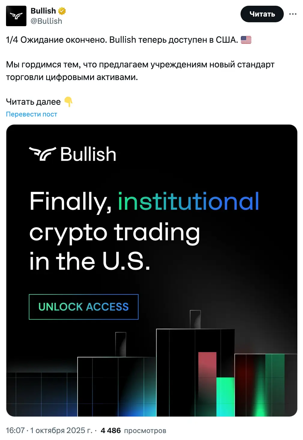 «Bullish был создан для институциональных клиентов, и теперь мы гордимся тем, что предлагаем такой же уровень производительности серьезным трейдерам по всей территории США».