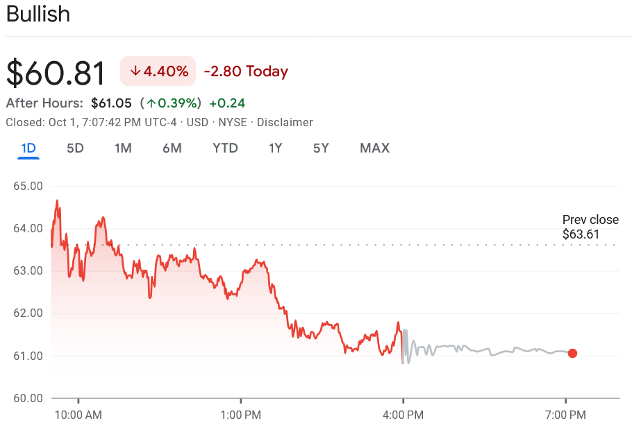 Несмотря на новости, акции Bullish упали на 4,4% до $60,80 в течение торгов в среду, согласно данным Google Finance.