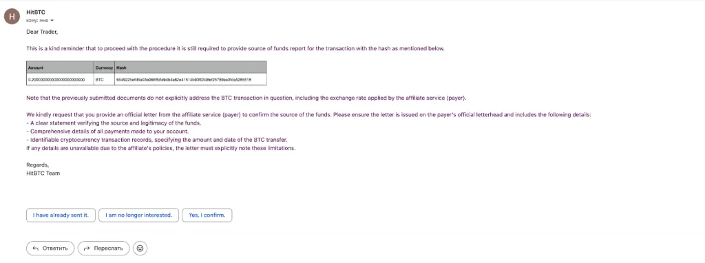 «Биржа потребовала уже заявление от партнера на фирменном бланке, подтверждающее легальность этих средств. При этом речь шла о платеже, полученном мной летом 2020 года, который я хранил на холодном кошельке до января 2025 года, когда ввел эти средства на HitBTC для покупки альткоинов. Прошло пять лет с момента оказания услуги, но биржа требует необоснованный документ, который фактически невозможно получить спустя такое время», — добавил он.