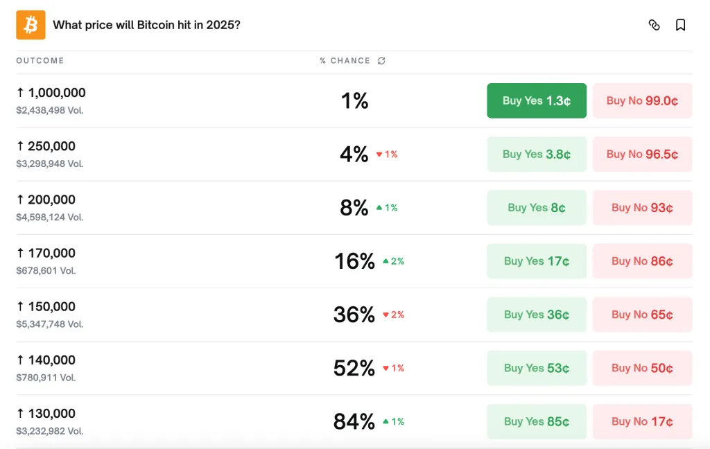 Ожидания от курса первой криптовалюты до конца 2025 года разделились. 84% участников считают, что показатель вырастет до $130 000. Еще 52% и 36% прогнозируют уровни $140 000 и $150 000 соответственно. Общий объем ставок в этом сегменте превышает $30,6 млн.
