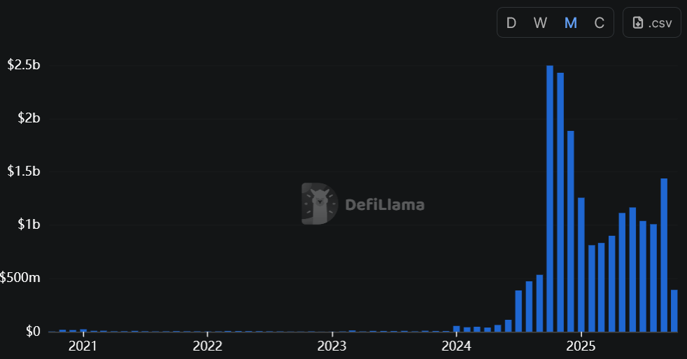 Ежемесячное изменение объема торгов Polymarket с октября 2020 года. Источник: DeFiLlama.