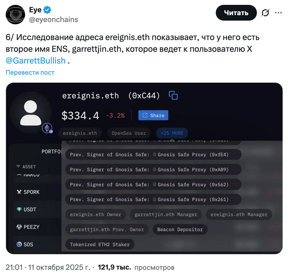 В субботнем посте на X ончейн-сыщик отметил, что основной кошелек кита, ereignis.eth, был связан с другим именем в ENS, garrettjin.eth, который напрямую ведет к верифицированному аккаунту Джина в Twitter, @GarrettBullish.