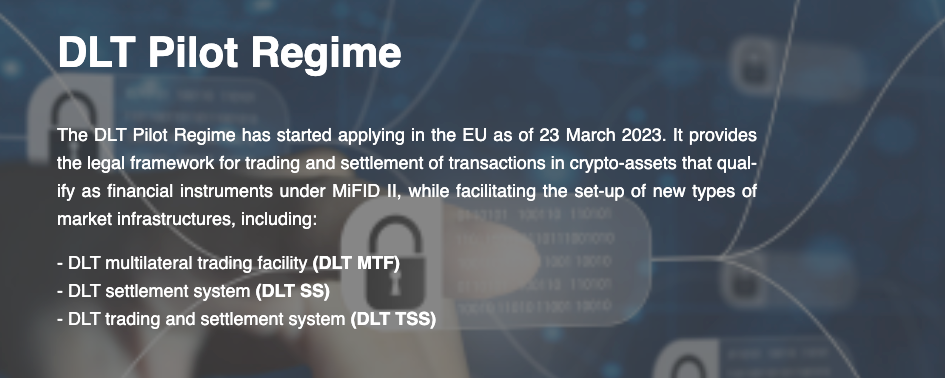 Пилотный режим DLT, вступивший в силу в марте 2023 года, обеспечивает правовую основу для торговли и проведения расчетов по транзакциям с активами криптовалюты, которые квалифицируются как финансовые инструменты в соответствии с Директивой о рынках финансовых инструментов (MiFID II).