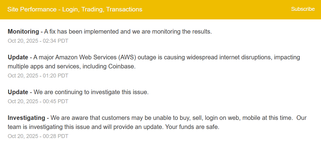 Coinbase и Robinhood оказались среди нескольких крупных платформ, пострадавших от сбоя в работе центра обработки данных Amazon Web Services (AWS) в понедельник. Этот инцидент подчеркнул риски использования централизованных облачных провайдеров для критически важной финансовой инфраструктуры.