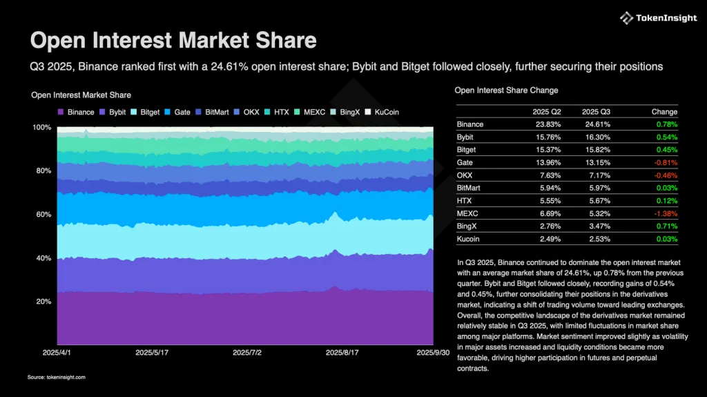 По открытому интересу лидирует Binance с долей рынка 24,61%, что на 0,7% больше, чем в прошлом квартале. В тройку крупнейших также вошли Bybit и Bitget, показавшие рост на 0,5% и 0,4% соответственно.