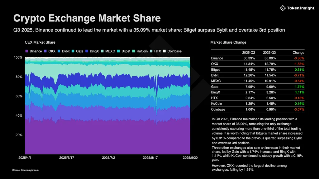 Binance сохранила лидирующую позицию с долей рынка в 35,09% — по сравнению со вторым кварталом показатель снизился на 0,3%. Биржа обеспечила более трети совокупного оборота спотовой торговли.