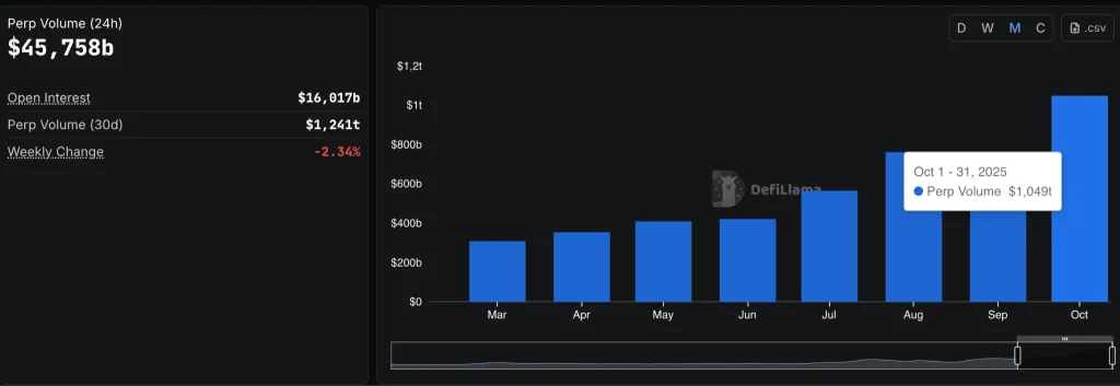 С начала октября объем торгов на децентрализованных биржах бессрочных контрактов превысил $1 трлн, свидетельствуют данные DeFi Llama. При этом до конца месяца остается еще неделя.
