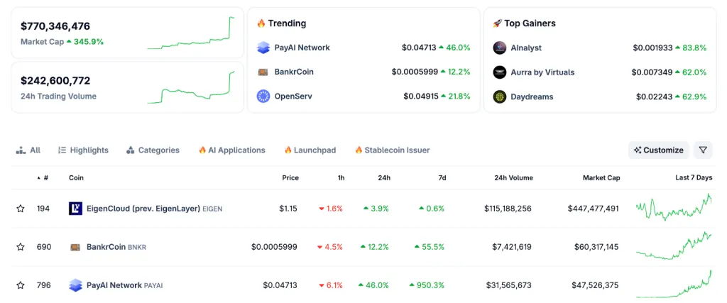 Капитализация сектора за сутки выросла на 345%, достигнув $770 млн. Лидером по объему остается EingenCloud с рыночной стоимостью свыше $115 млн.