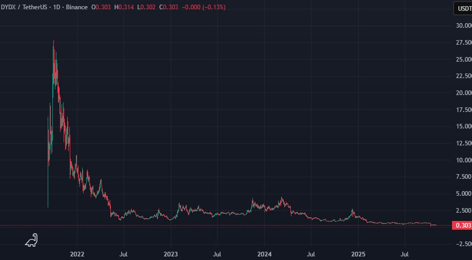 Отметим, токен проекта DYDX торгуется вблизи отметки в $0,3. От исторического максимума он обвалился почти на 100%: