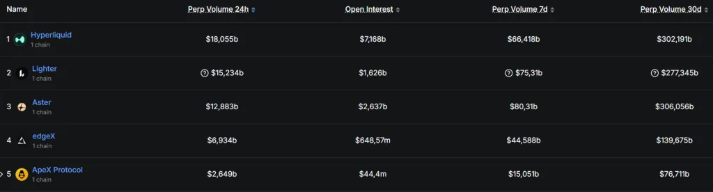 Подъему отдельных платформ способствовали и другие факторы: Lighter привлекает трейдеров нулевыми комиссиями, при этом Aster пользуется поддержкой экосистемы BNB Chain.