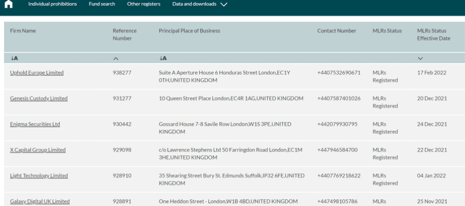Регистрация фирмы по криптоактивам в Великобритании считается одной из самых строгих, поскольку некоторые ведущие мировые криптобиржи, такие как Binance, не смогли получить лицензию. Среди 32 утвержденных компаний есть такие крупные имена, как Gemini, Genesis, Coinjar и Robinhood.