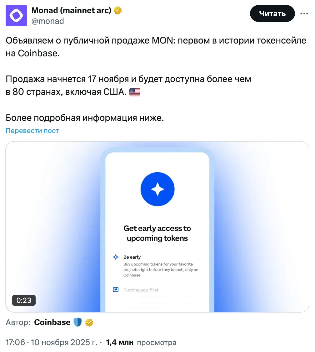 Coinbase запускает новую платформу для первичных размещений токенов, предоставляя розничным инвесторам в Соединенных Штатах доступ к регулируемым продажам криптовалют. Биржа будет проводить около одного размещения в месяц, начиная с блокчейн-протокола Monad, чей нативный токен MON поступит в продажу с 17 по 22 ноября.