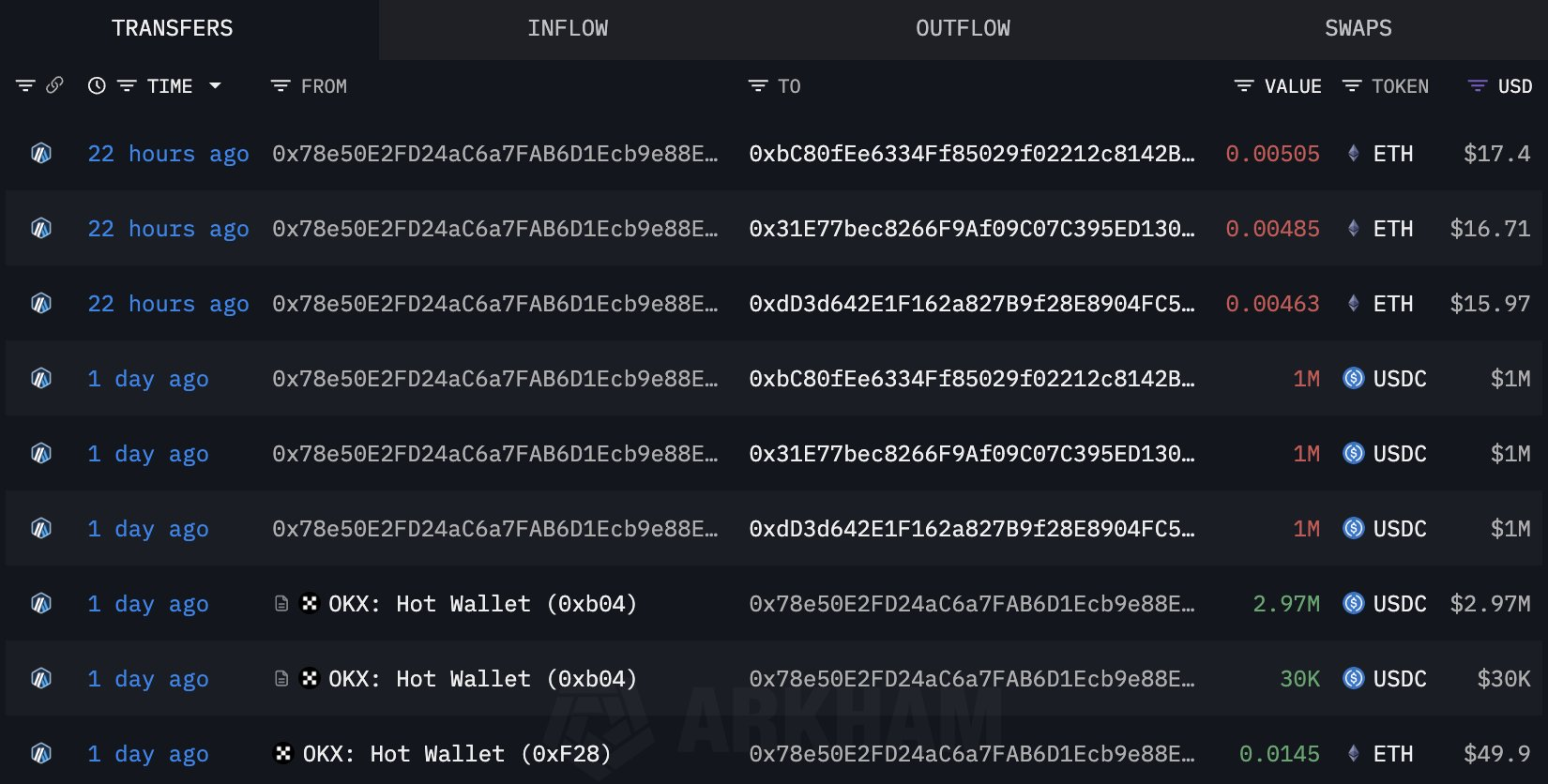 Трейдер начал операцию с вывода 2,97 млн USDC со своего кошелька на бирже OKX на отдельный адрес под своим контролем. Позже он перевел на этот же адрес еще около $30 000 и немного ETH для комиссий.