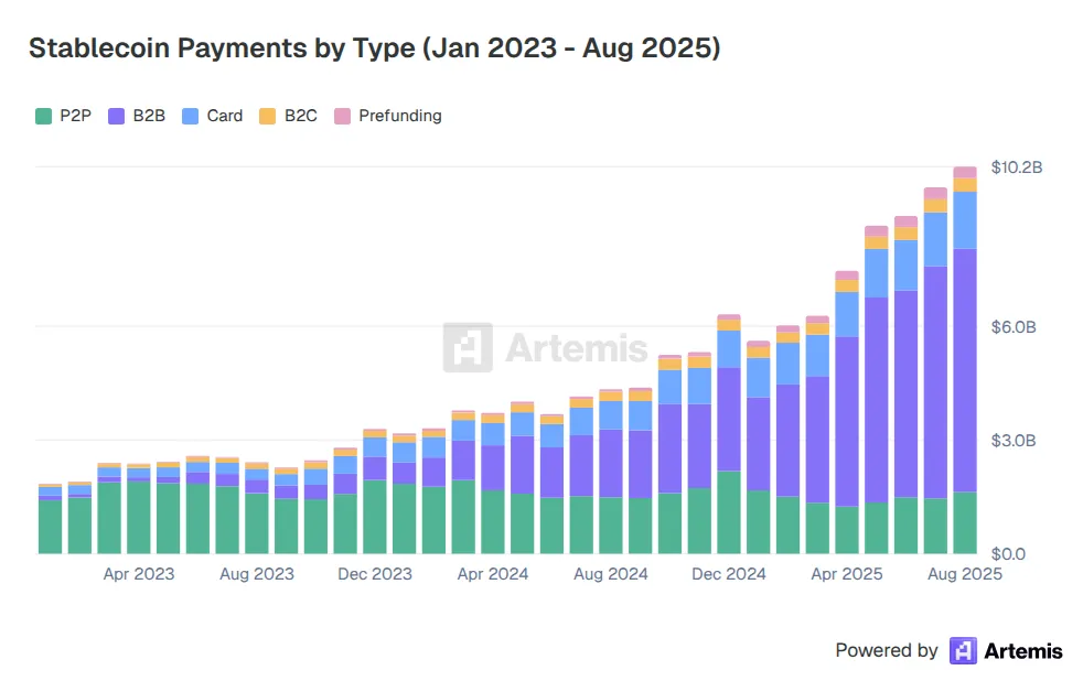 По данным Artemis за октябрь 2025 года, ежемесячные объемы платежей в стейблкоинах превысили $10 млрд в августе. С начала года показатель вырос на 82%.