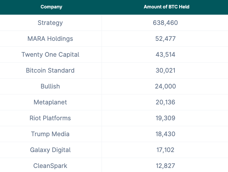 Компания Twenty One Capital при поддержке SoftBank входит в десятку крупнейших публичных держателей биткоина (по данным на 6 ноября 2025 года). Источник: CoinGecko