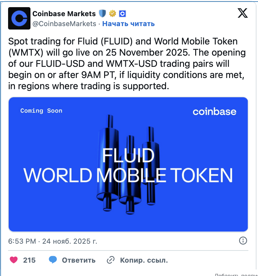 Платформа Coinbase сообщила о запуске спотовых торгов для пар FLUID-USD и WMTX-USD. Операции станут доступны пользователям 25 ноября 2025 года. Это решение открывает активам прямой доступ к ликвидности американского рынка.