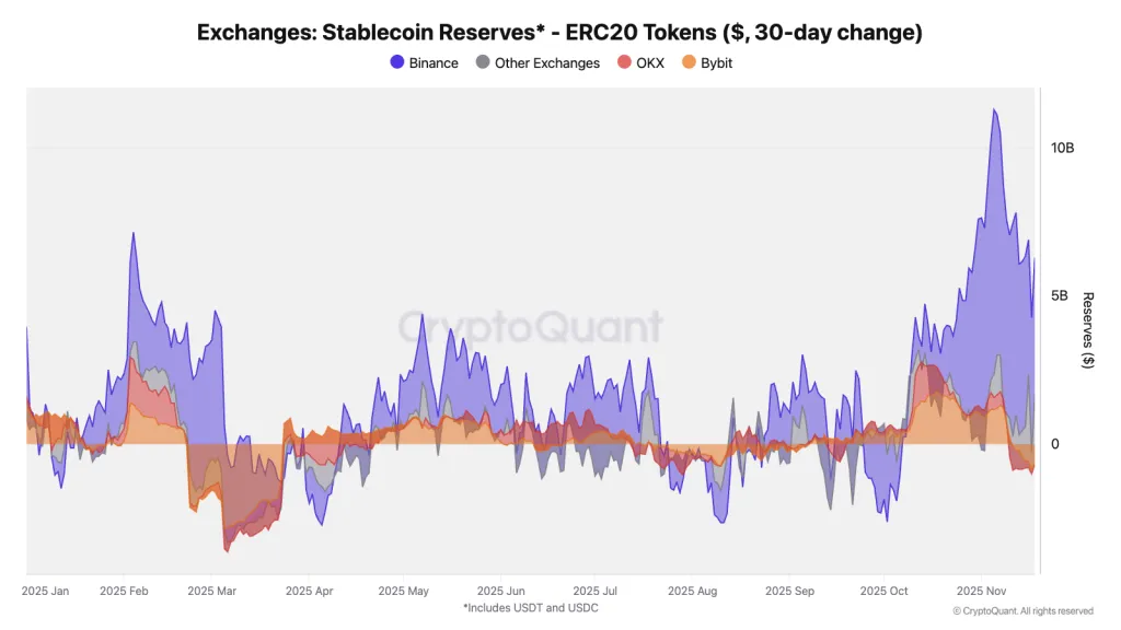 В октябре приток стейблкоинов на Binance превысил $60 млрд, тогда как Coinbase привлекла $33 млрд. В ноябре тенденция сохранилась: на Binance поступило $29 млрд в USDT и USDC против $19 млрд у Coinbase.