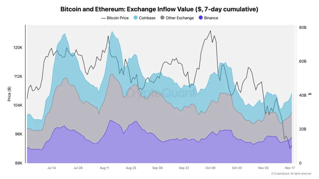 Binance привлекает более трети общего притока биткоина и Ethereum на централизованные биржи. Общий дневной объем поступлений двух основных криптовалют на торговые площадки вырос до $40 млрд, из которых $15 млрд приходится на Binance. Coinbase занимает второе место с $11 млрд.