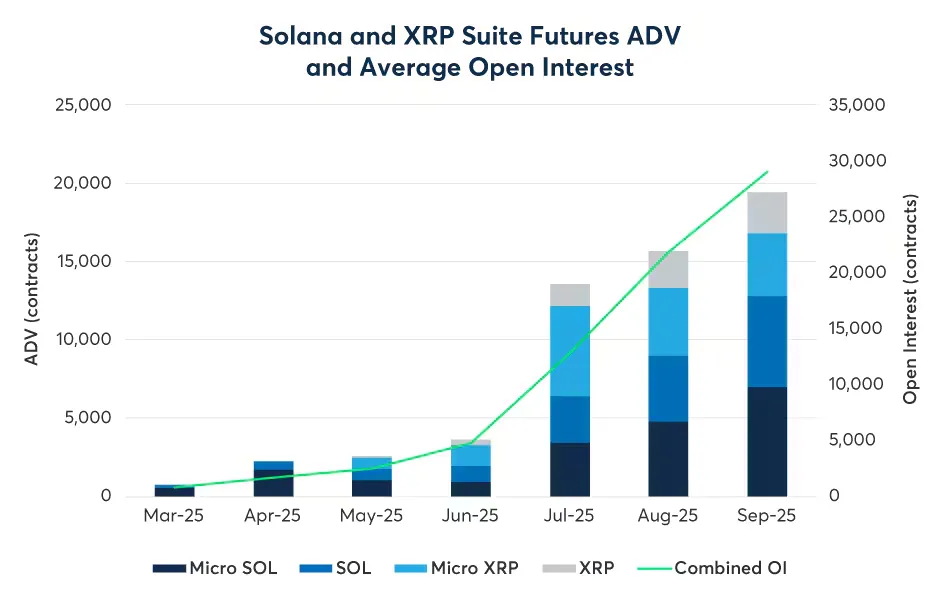 С марта количество контрактов по Solana превысило 730 000 на сумму $34 млрд, а по XRP — 476 000 на $23,7 млрд.