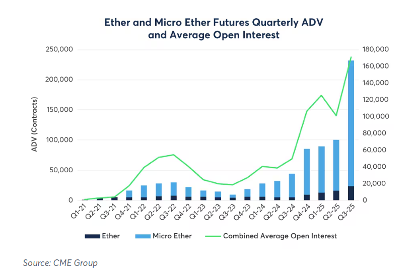 Активность в сегменте деривативов расширилась не только на биткоин, но и на эфир — родной токен Ethereum. Торговля фьючерсами на эфир и микро‑эфир показала резкий рост.