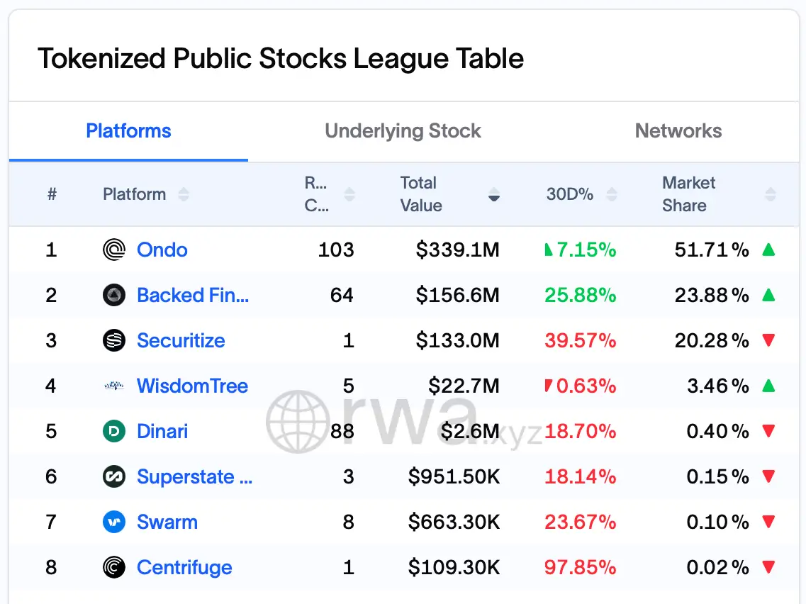 RWA.xyz отслеживает около $656 млн в регулируемых токенизированных публичных акциях. Месячный объем переводов составляет $1,14 млрд, а число держателей — около 118 000. Среди регулируемых эмитентов Ondo занимает около 52% рынка, Backed Finance — 24%, Securitize — 20%.