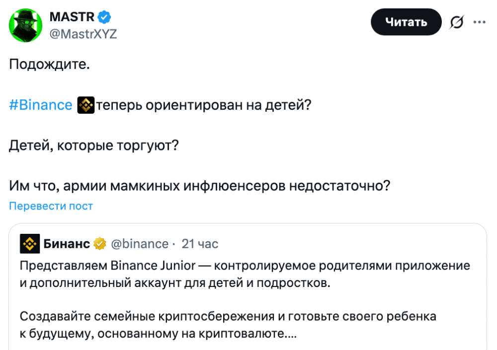 Один из пользователей X выразил недовольство действиями Binance, указав на излишнее внимание к детской аудитории. Он отметил, что индустрия уже предпринимает достаточно маркетинговых усилий, ориентированных на молодежь.