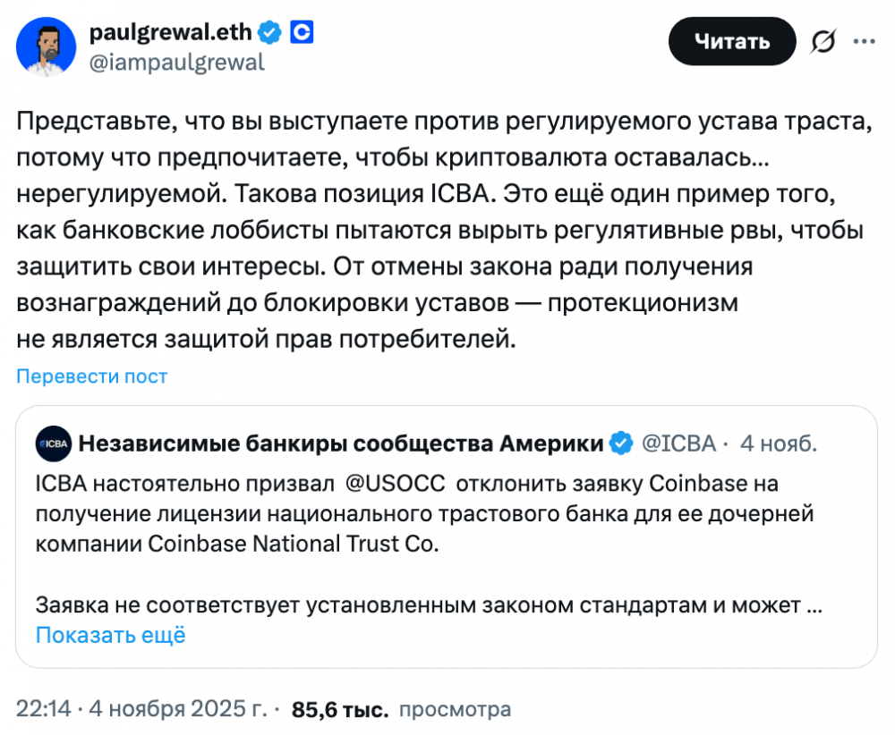 Главный юрисконсульт Coinbase Пол Гревал прокомментировал ситуацию в соцсети X: