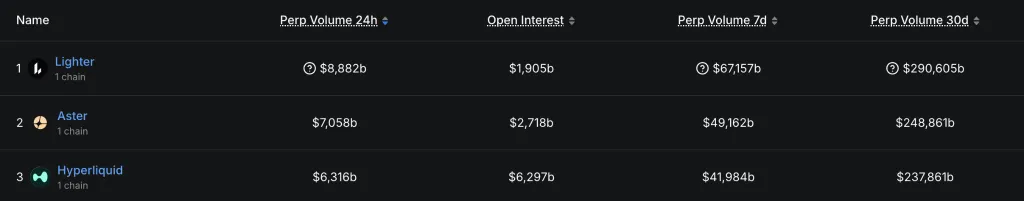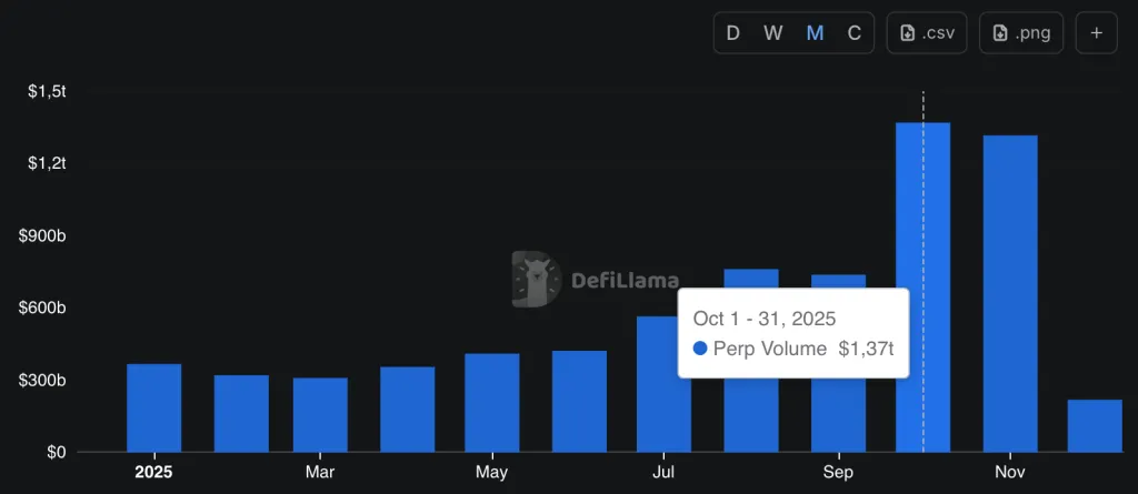 Общий объем торгов бессрочными фьючерсами достиг рекордных $1,2 трлн в октябре, чему способствовал обвал рынка и ажиотаж вокруг платформ вроде Lighter и Aster.